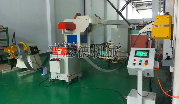 沖壓自動(dòng)化生產(chǎn)線中,送料機(jī)是根據(jù)沖壓工藝之需求步進(jìn)化送料的,因此重型材料架開(kāi)卷時(shí)需配合后續(xù)整平機(jī)、送料機(jī)時(shí)開(kāi)時(shí)停的運(yùn)行,而標(biāo)準(zhǔn)重型材料架開(kāi)停的控制是通過(guò)安裝在機(jī)身側(cè)面的感應(yīng)桿(可根據(jù)客戶需求換為落地式感應(yīng)架)來(lái)感應(yīng)控制的。標(biāo)準(zhǔn)重型材料架的自動(dòng)化控制原理是:感應(yīng)桿帶有24V直流電壓并與機(jī)臺(tái)緣,卷料經(jīng)材料架開(kāi)卷后料帶向后續(xù)機(jī)臺(tái)輸入時(shí)會(huì)下垂一定的弧度,當(dāng)弧度過(guò)大接觸到感應(yīng)架時(shí),24V感應(yīng)電路接通,經(jīng)中間繼電器、時(shí)間繼電器控制機(jī)臺(tái)停止運(yùn)轉(zhuǎn),當(dāng)后續(xù)機(jī)臺(tái)持續(xù)使用料帶,使料帶脫離感應(yīng)架時(shí),材料架就會(huì)繼續(xù)放料,如此實(shí)現(xiàn)了全自動(dòng)化的控制材料架的開(kāi)停,只是此種控制方式必須要求所開(kāi)卷的材料表面能導(dǎo)電才能實(shí)現(xiàn)。