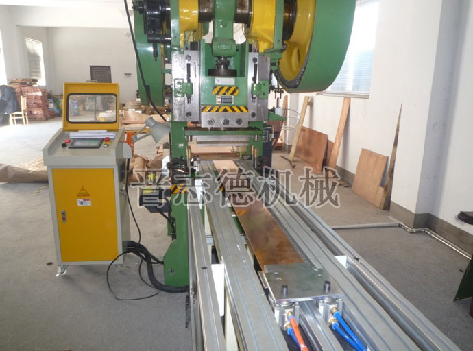 為從根本上解決片材無(wú)法自動(dòng)送料的難題,晉志德機(jī)械專門設(shè)計(jì)研發(fā)生產(chǎn)了一款片材送料機(jī),其由上料機(jī)構(gòu)、送料機(jī)構(gòu)、推料機(jī)構(gòu)、電控機(jī)構(gòu)四大功能組件組成,上料機(jī)構(gòu)、送料機(jī)構(gòu)及推料機(jī)構(gòu)的動(dòng)作均由電控組件控制,通過(guò)在立控制電箱的觸摸面板上簡(jiǎn)單的設(shè)定送料相關(guān)參數(shù)后,即可將片材準(zhǔn)確自動(dòng)化的送入沖床沖壓位置,實(shí)現(xiàn)連續(xù)高精度的沖壓生產(chǎn),不僅節(jié)約了沖壓加工時(shí)間、提高了生產(chǎn)效率,而且從根本上確保了沖壓加工生產(chǎn)的安全性。