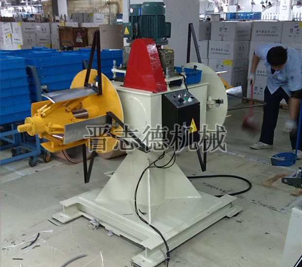 在目前的沖壓生產(chǎn)過程中,多數(shù)采用的是重型材料架來放置料卷,重型材料架由基座與安裝在基座上的主軸兩大結構組件組成,其中主軸上另外設置有靠背輪、托塊、漲縮卷筒,卷料通過套在主軸漲縮卷筒上來實現(xiàn)放料與開卷,重型材料架在使用時,當一卷材料用完后,則需將整個生產(chǎn)線停止下來重新裝載卷料,由于材料架承載卷料重量大,因此需很長的裝料時間,大地限制了整個沖壓生產(chǎn)線的有效工作時間;另一方面,重型材料架這種單軸放料方式為保證轉矩的均勻,主軸只能設置于基座的中央,這樣雖不會出現(xiàn)轉軸松動、傾斜的現(xiàn)象,但會導致裝料的十分不便。
