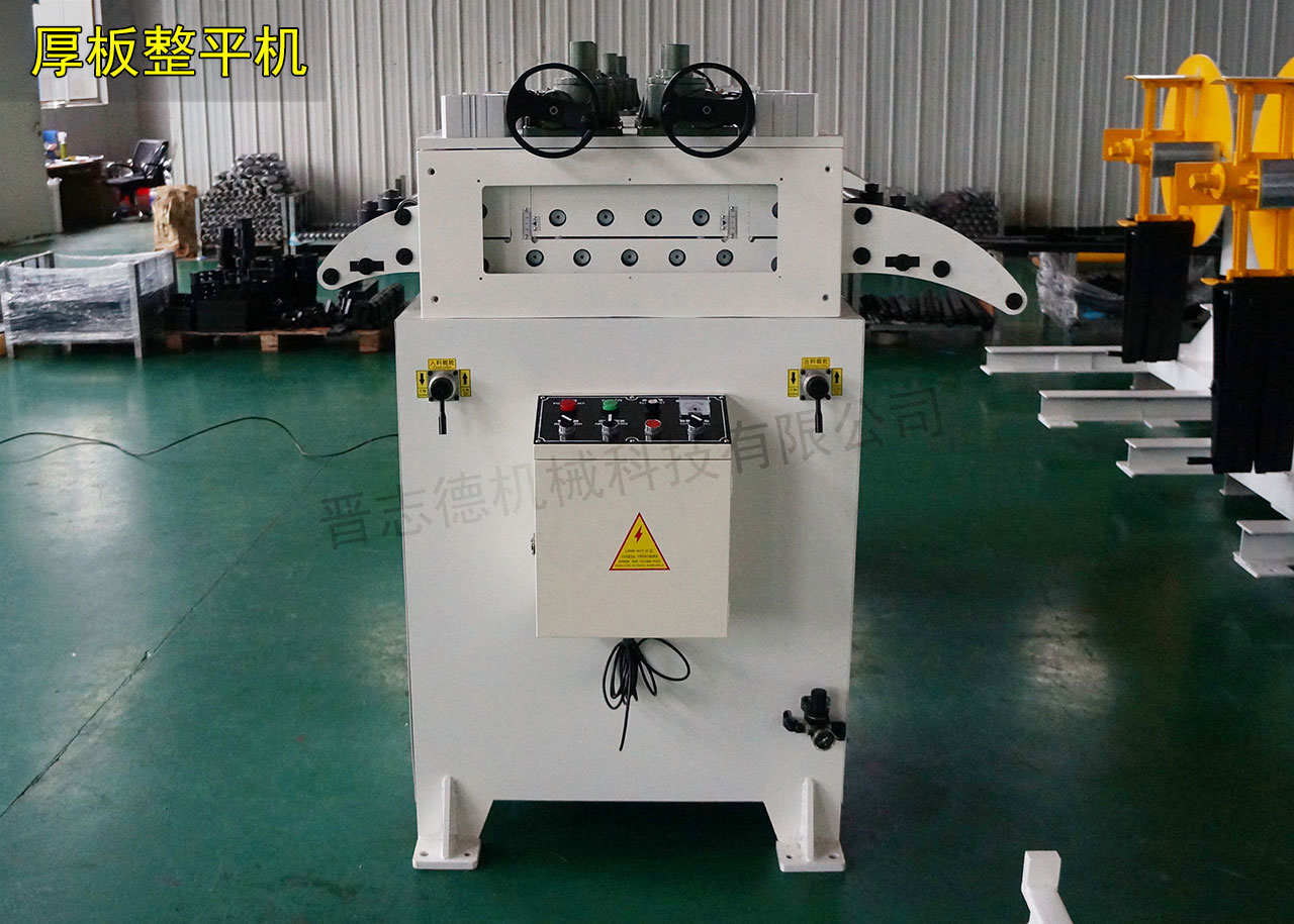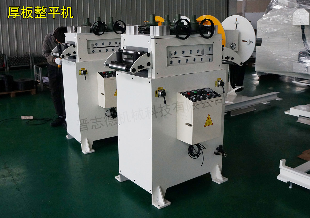 沖壓制造行業(yè)除需使用到0-3.0mm的薄板、中板材料外,同樣也會用到3.0mm以上的厚板材料,用于此類厚板材料整平的設備則稱為厚板整平機,厚板整平機又分為適用料厚0.5-4.5mm與適用料厚1.0-6.0mm的這兩種款式,它們的外觀為相似,但其使用的滾筒直徑、馬達的大小及齒輪齒合的角度是不同的。