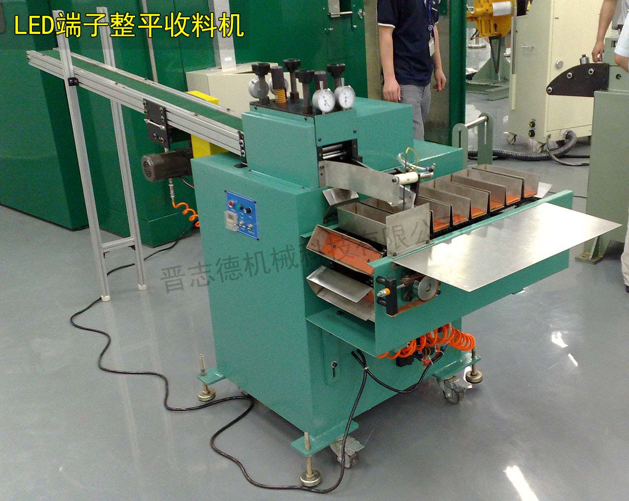 晉志德LED端子整平收料機由輸送帶、整平裝置、收料裝置三部分組成,由連續(xù)模所沖制的略彎端子、半導體、LED、電晶體等電子元件類的支架經(jīng)由輸送帶輸送進入整平機的上下滾壓輪間,經(jīng)整平后的電子元件類支架再由收料裝置予以計數(shù)收料、堆疊,堆疊一定數(shù)目后可自動移送以供取出,整平收料速度能達30片/min,大了滿足了端子廠整平收料之需求。