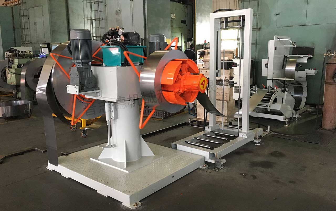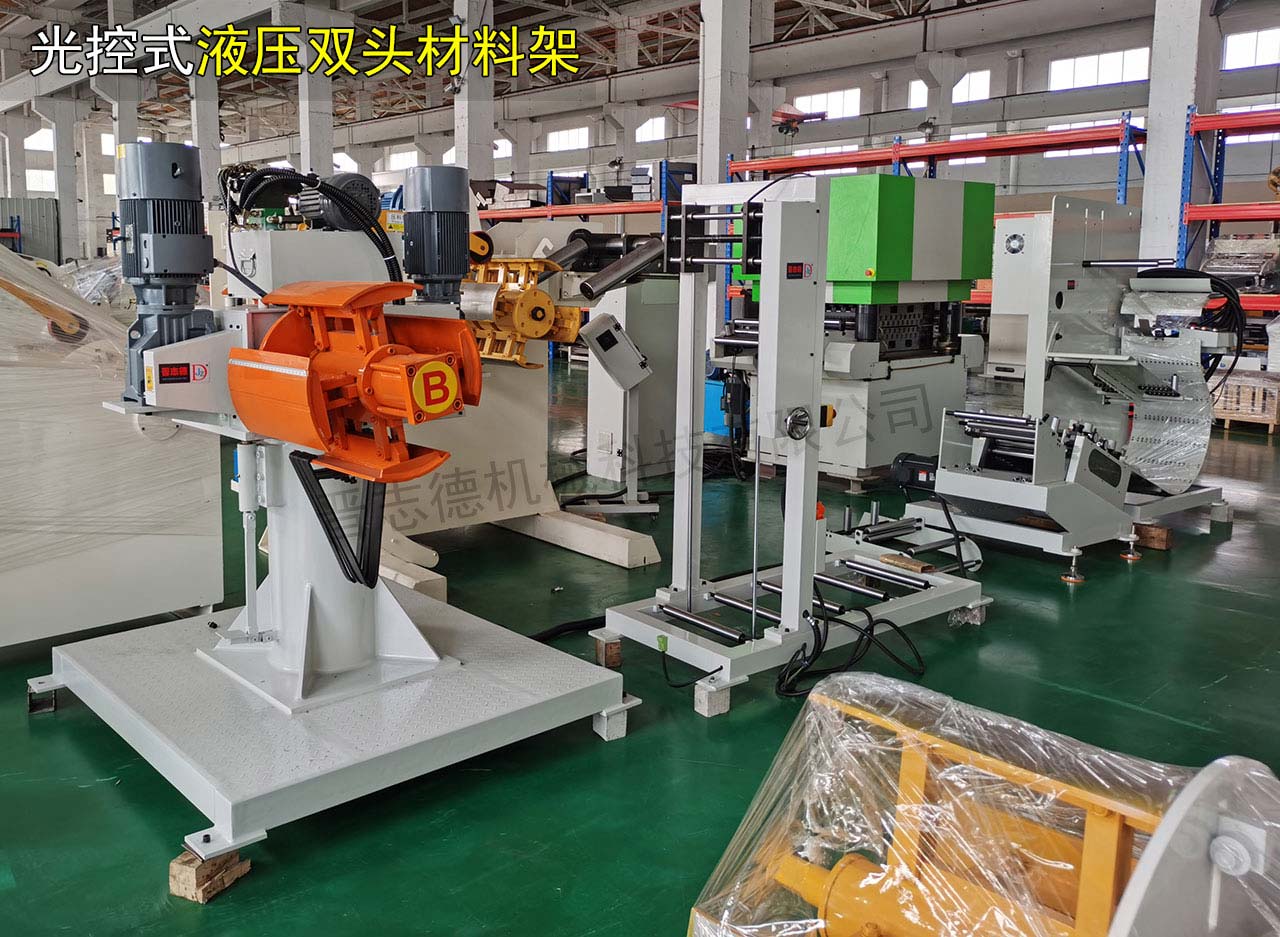 雙頭材料架有兩種款式,一種為無動(dòng)力型,一種為有動(dòng)力式,不過兩者結(jié)構(gòu)類似,其都有兩個(gè)漲縮卷筒,其間隔為180度,其間通過旋轉(zhuǎn)軸連接,旋轉(zhuǎn)軸和兩個(gè)漲縮卷筒整體呈“十”字形,旋轉(zhuǎn)馬達(dá)通過驅(qū)動(dòng)旋轉(zhuǎn)軸旋轉(zhuǎn)使兩個(gè)漲縮卷筒旋轉(zhuǎn),可交替進(jìn)行開卷作業(yè),當(dāng)一個(gè)漲縮卷筒正常開卷時(shí),另一個(gè)漲縮卷筒可從容地使用行車或叉車進(jìn)行上卷,省略了停機(jī)裝料時(shí)間,從而使得材料在沖壓生產(chǎn)線上能夠連續(xù)不斷的行進(jìn),提高了流水線的生產(chǎn)效率。